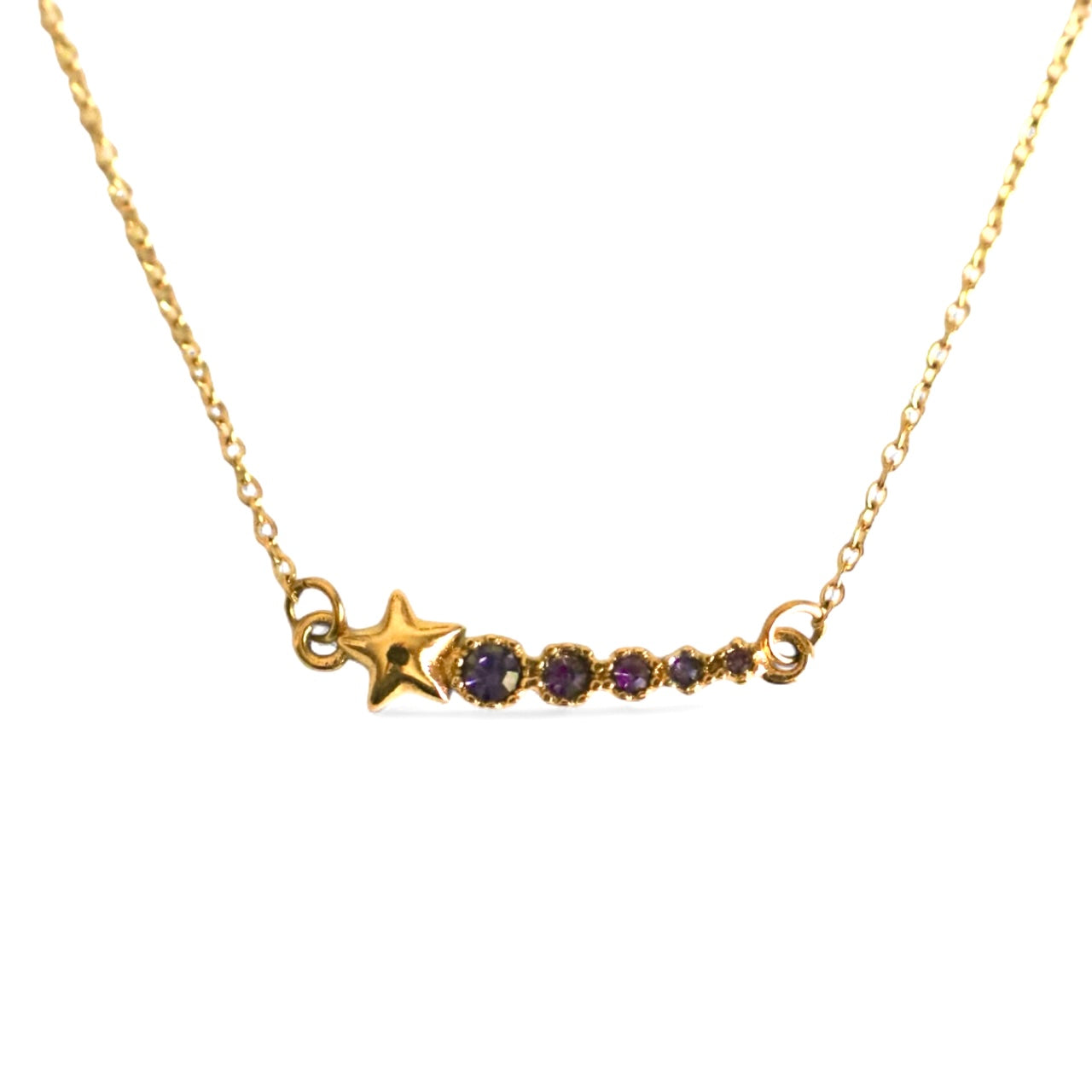 This shooting star shaped necklace features four purple zirconia crystals and the words “This turbulence wasn’t forecasted” engraved on the back.