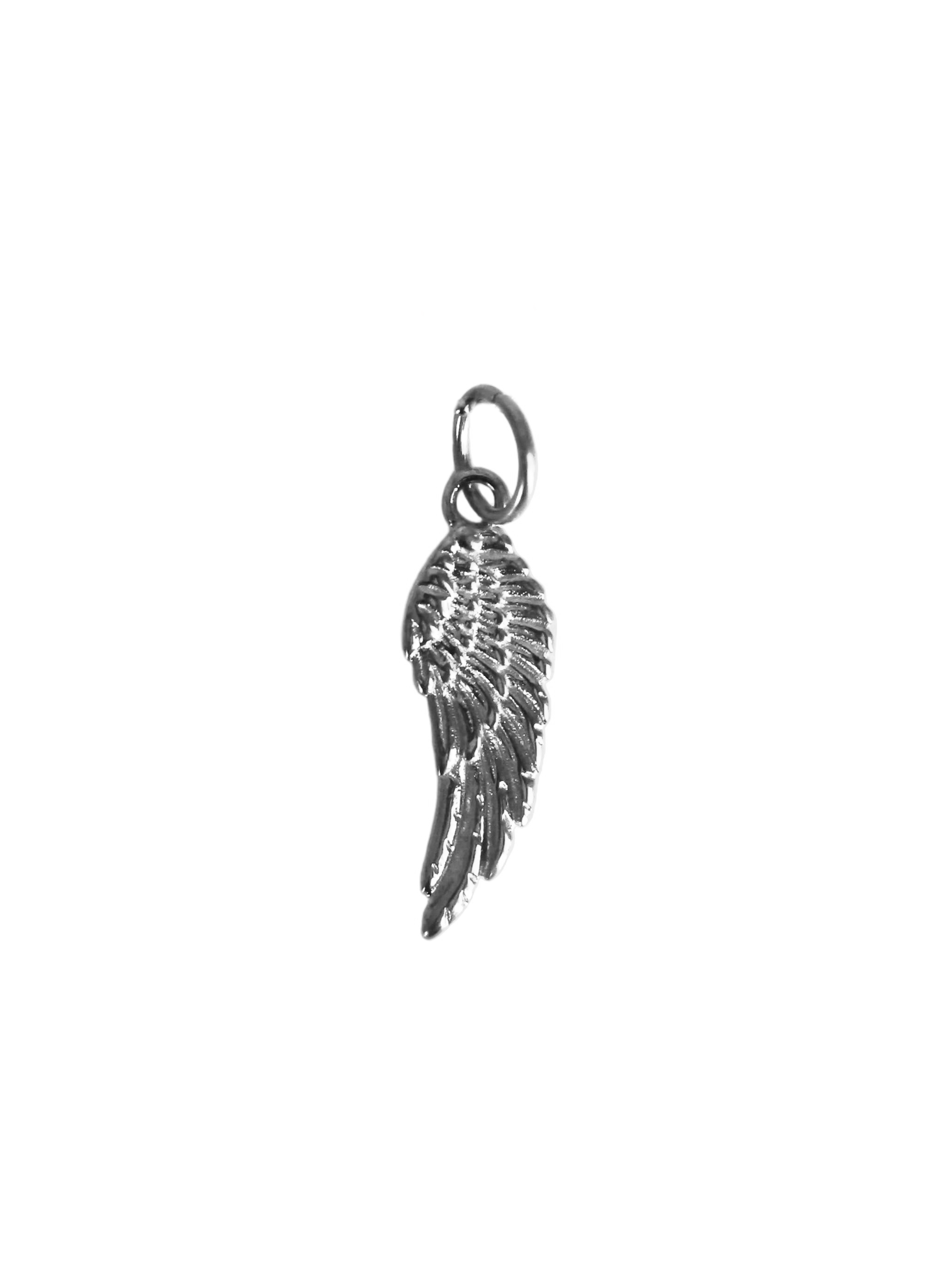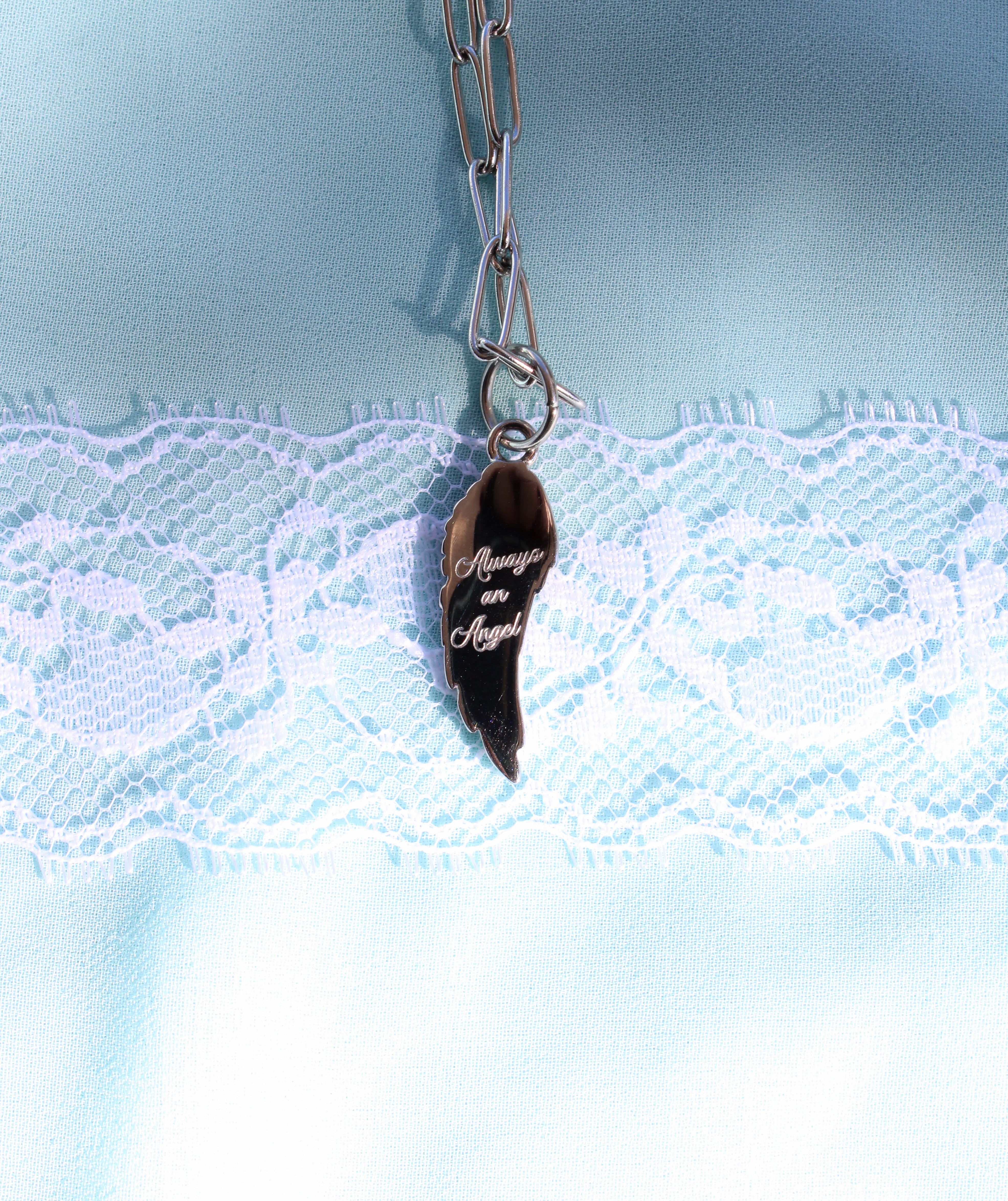 An angel wing charm with the words "Always an Angel" engraved on the back.