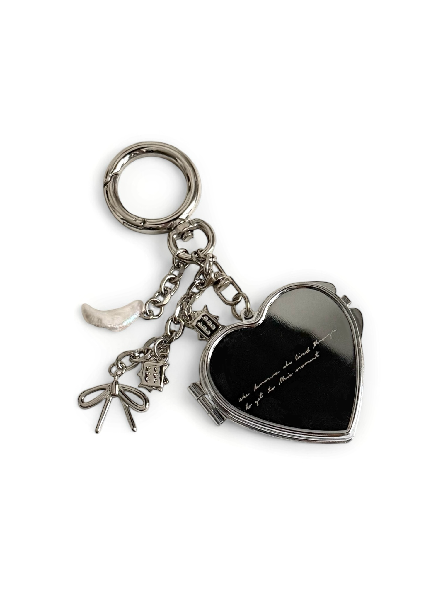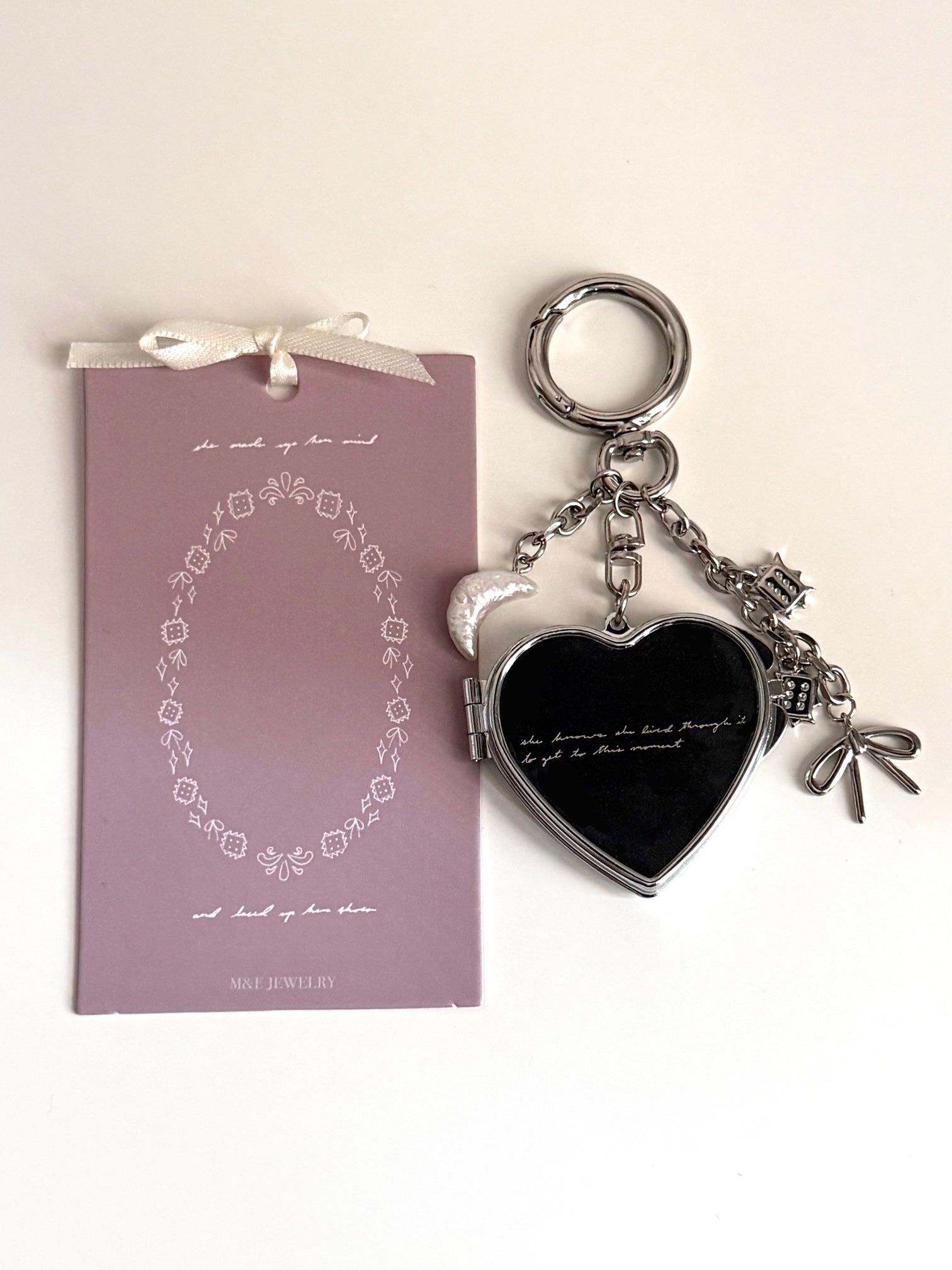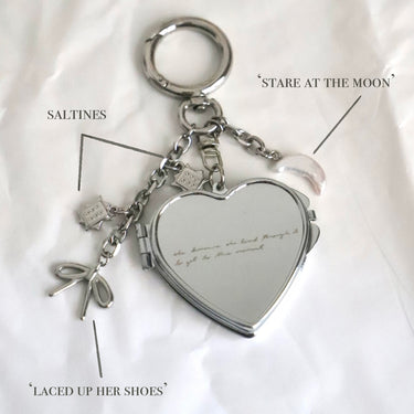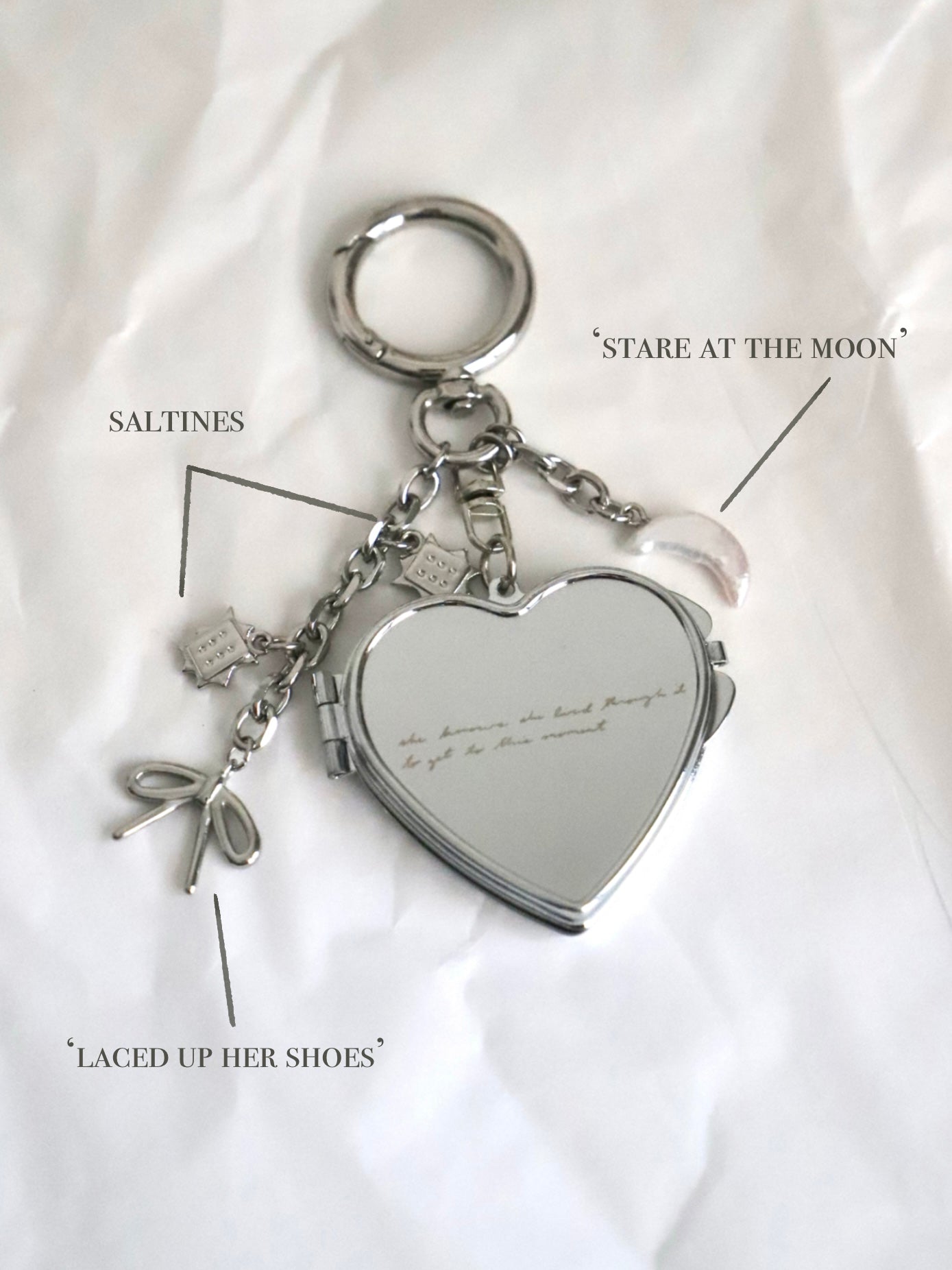 A keychain with a heart shaped opening mirror with the words 'she knows she lived through it to get to this moment' engraved on the front in Phoebe's handwriting. Along with a moon shaped pearl, two saltine charms, and a bow charm.
