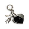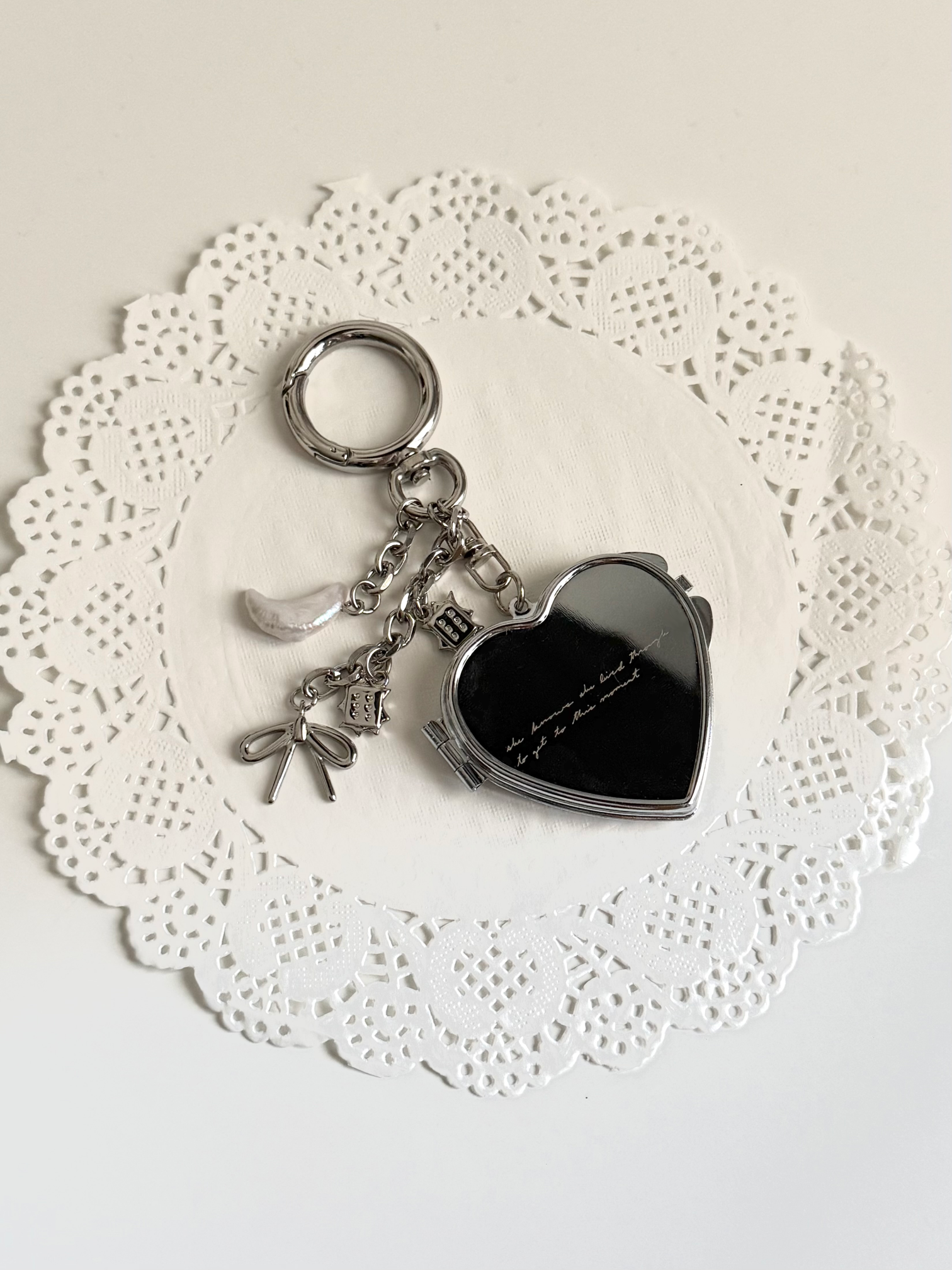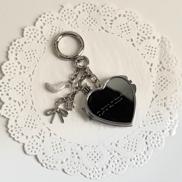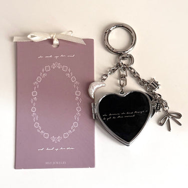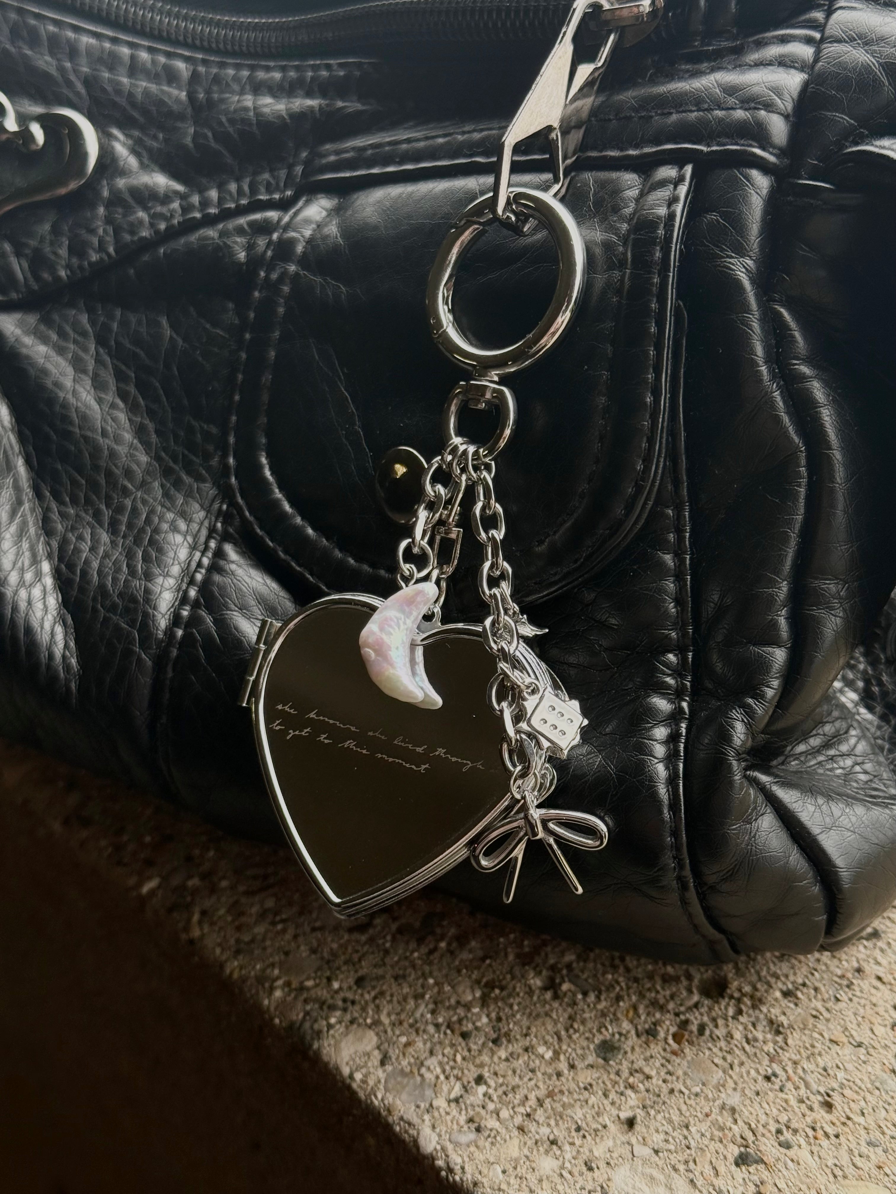 A keychain with a heart shaped opening mirror with the words 'she knows she lived through it to get to this moment' engraved on the front in Phoebe's handwriting. Along with a moon shaped pearl, two saltine charms, and a bow charm.