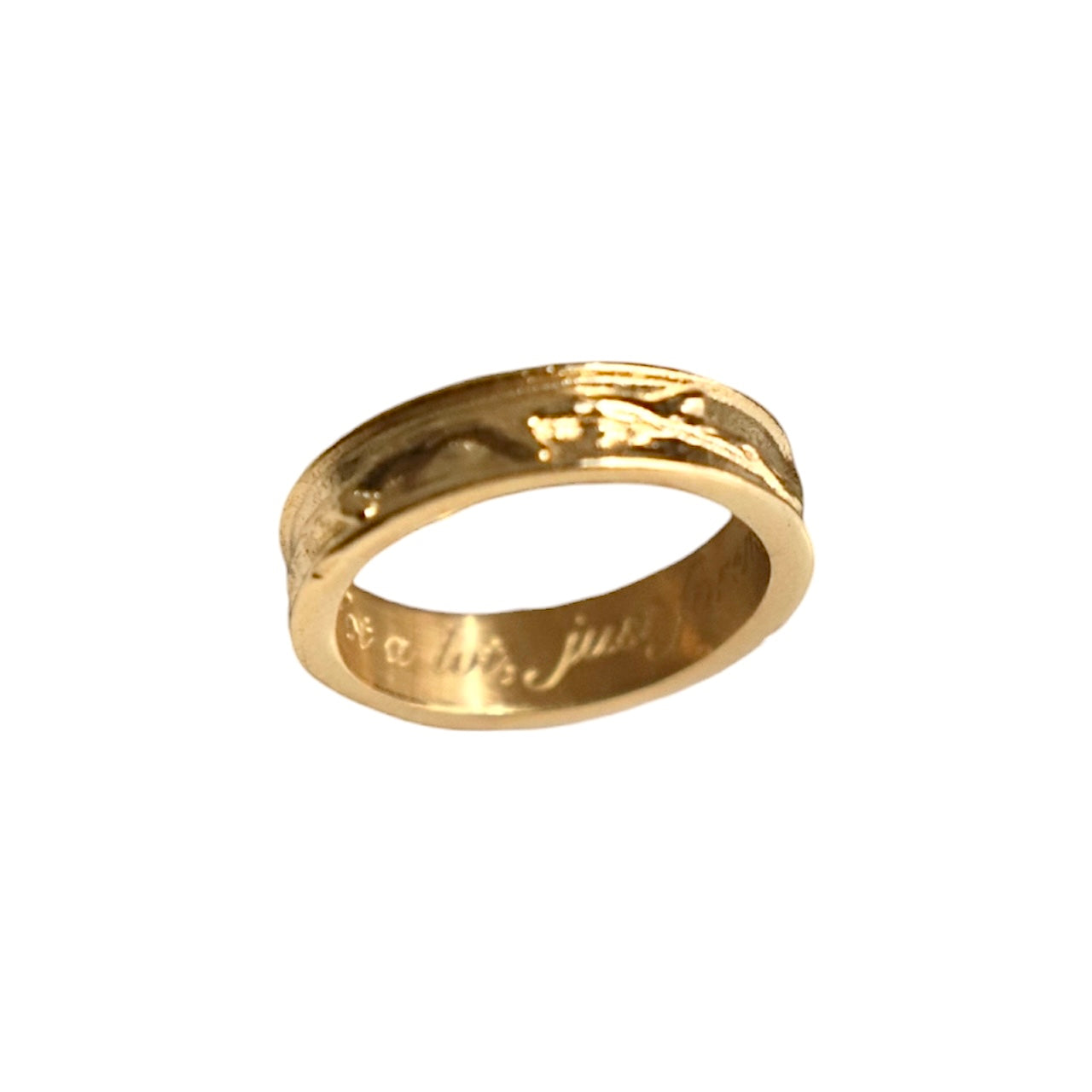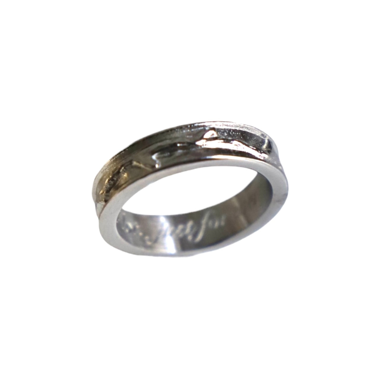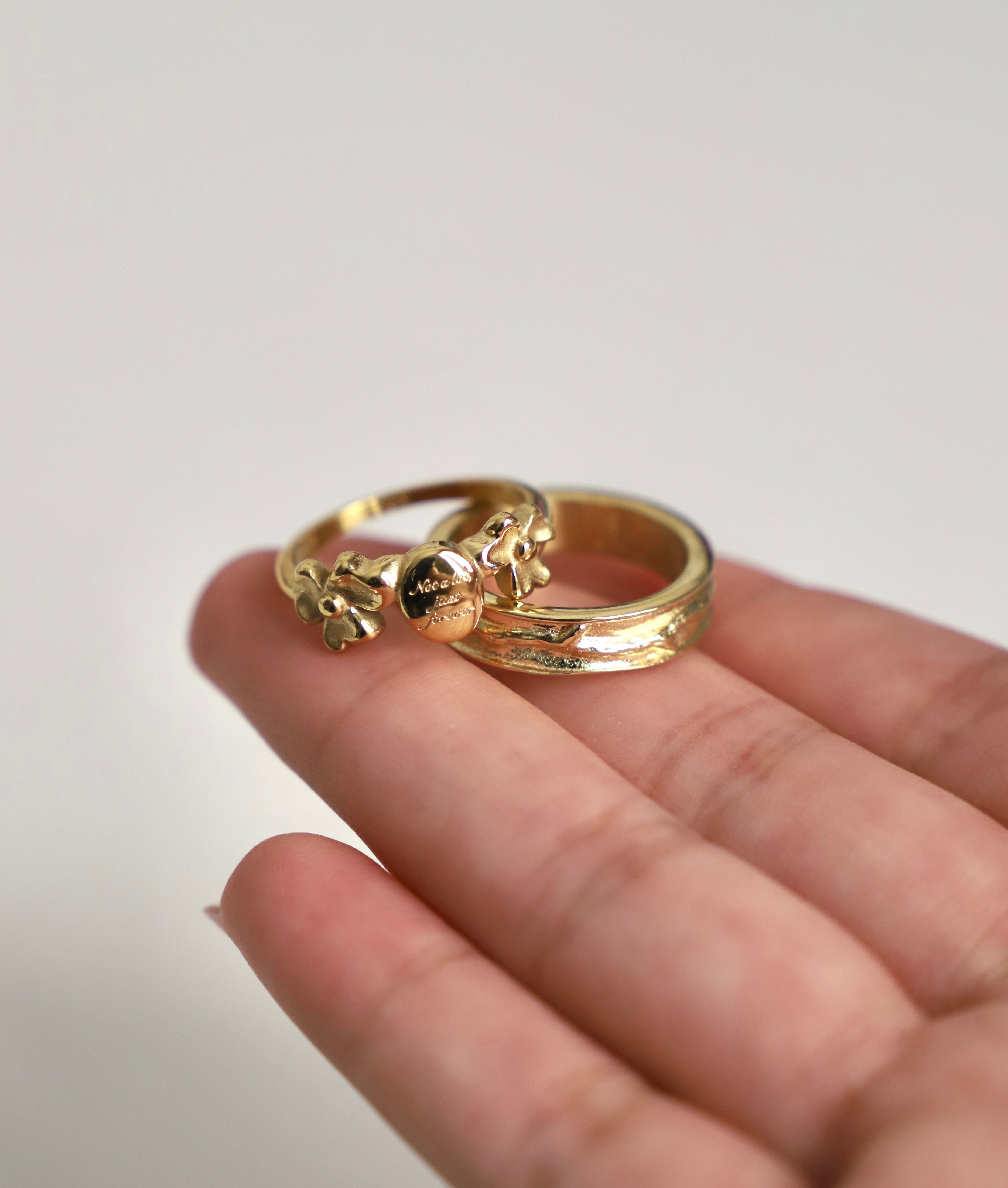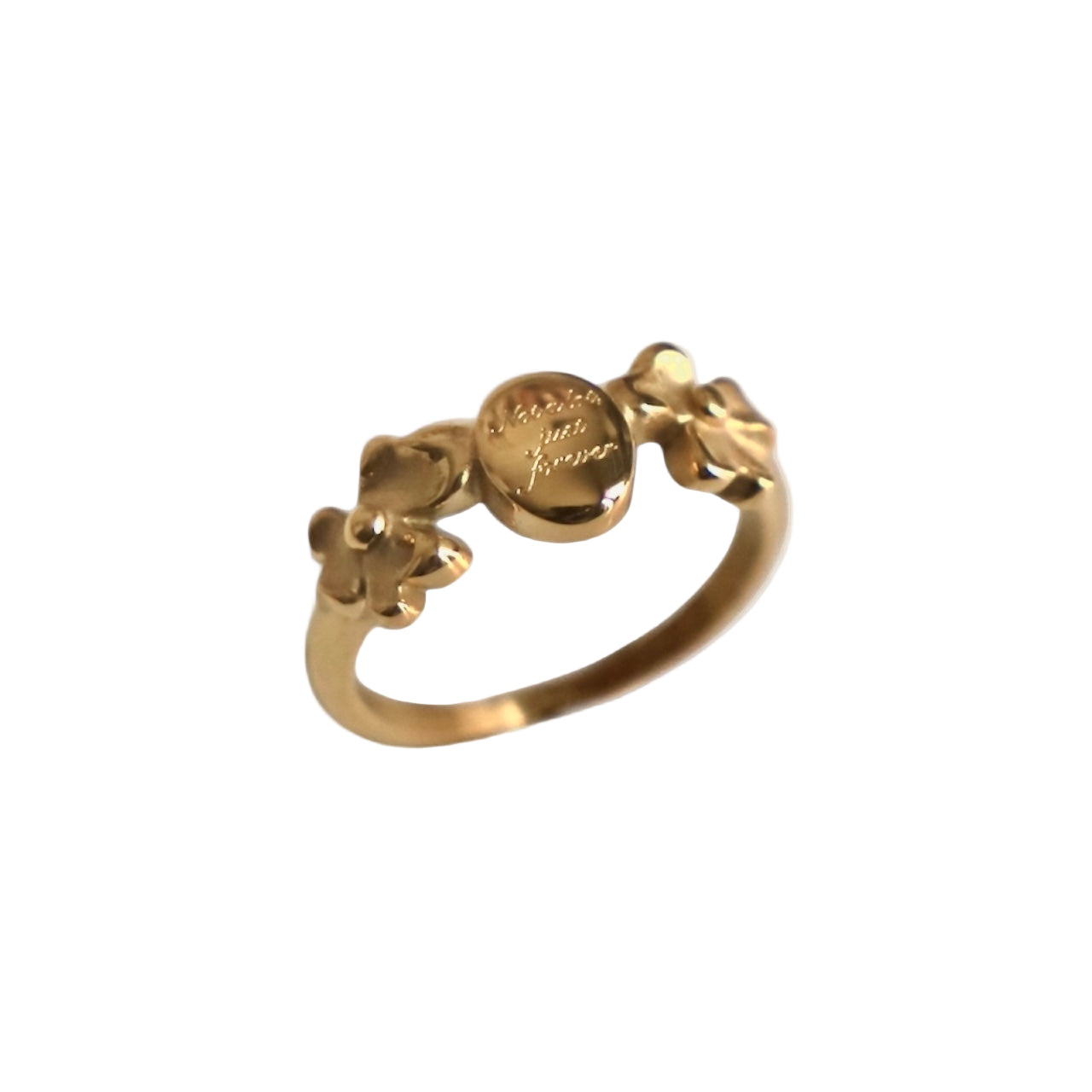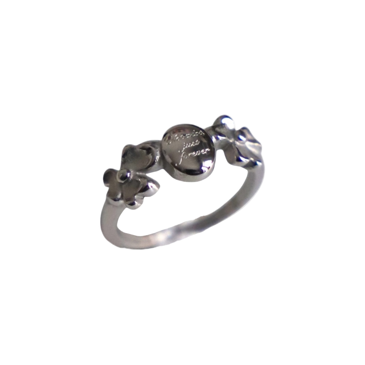 Two matching friendship/relationship rings. One ring features two flowers on the front with an oval face in the center along with an engraving on it that reads 'Not a lot. just forever'. The other ring features a branch design on a band ring with the words 'Not a lot. just forever' engraved on the inside.