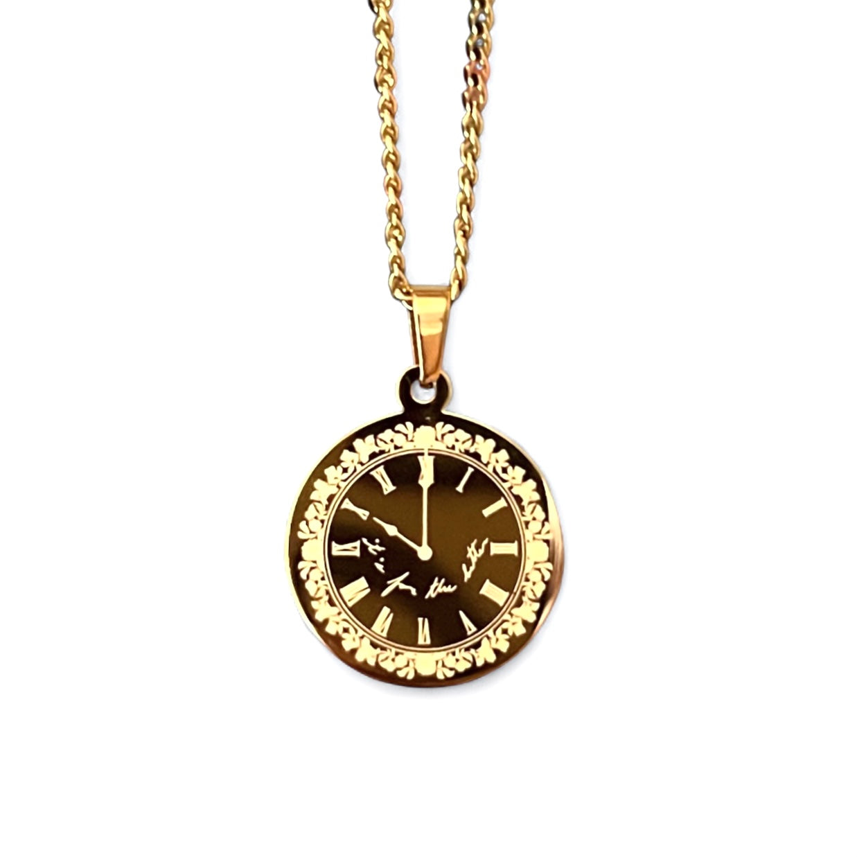 This necklace features a clock with a patterned border around it with the words "it's for the better" engraved onto a circle pendant.