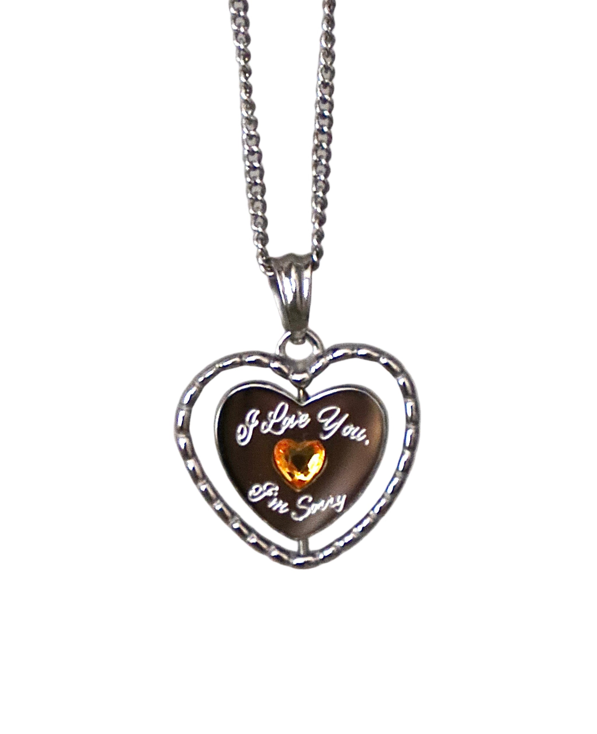 A rotating necklace featuring a heart crystal in the center. Along with the words, ‘I love you, i’m sorry’ on the front and ‘i miss you, i’m sorry’ on the back.