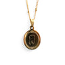 A dainty necklace with an oval shaped pendant featuring a tooth outline with a border around it engraved on the front.