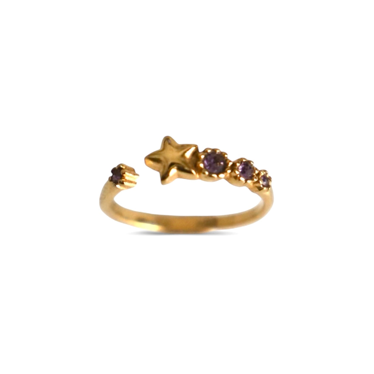 A shooting star shaped ring featuring four purple zirconia crystals. Along with the words "this turbulence wasn’t forcasted" engraved on the back of the band.