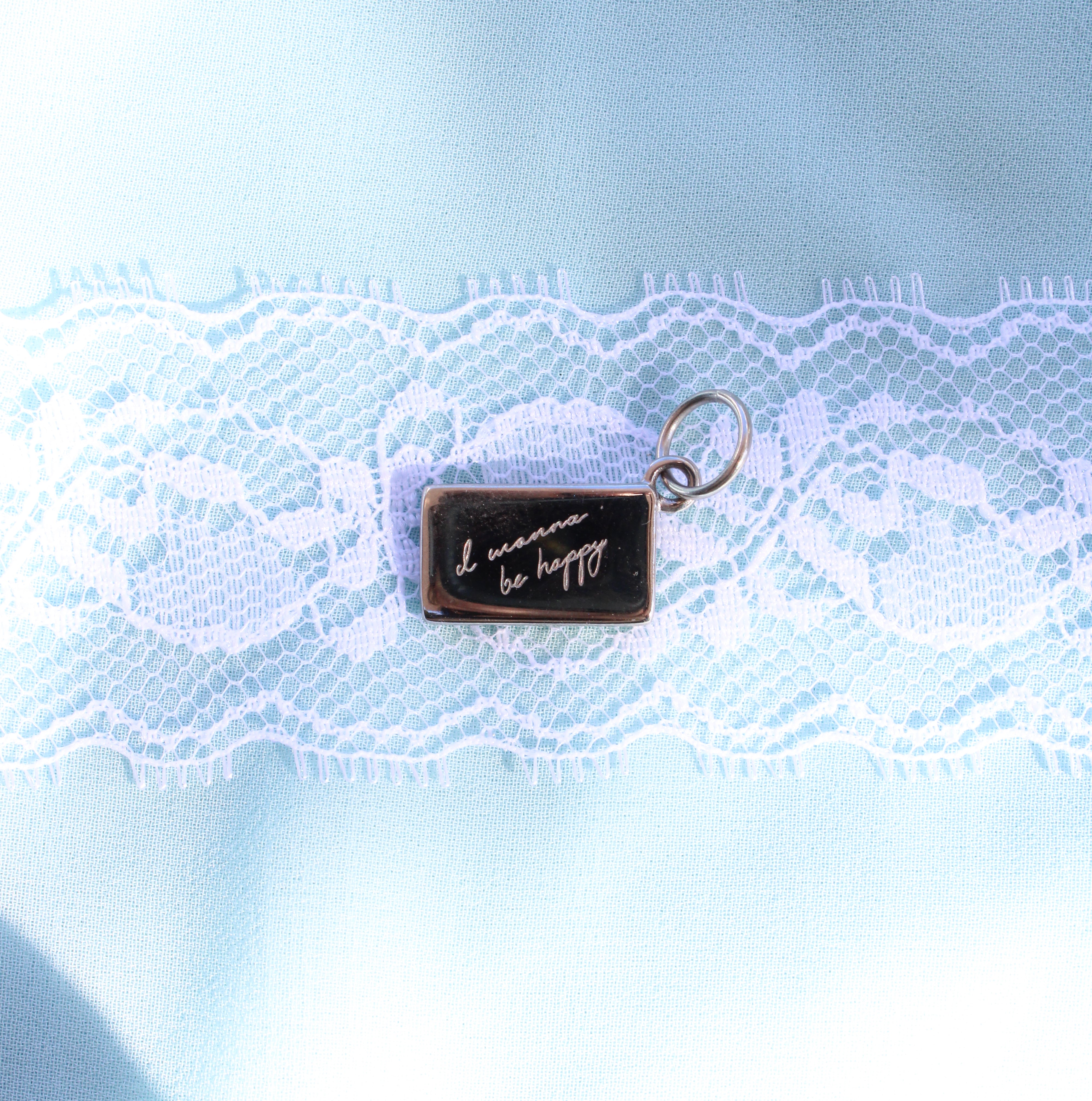 An envelope shaped charm with the words "I wanna be happy" engraved on the back.
