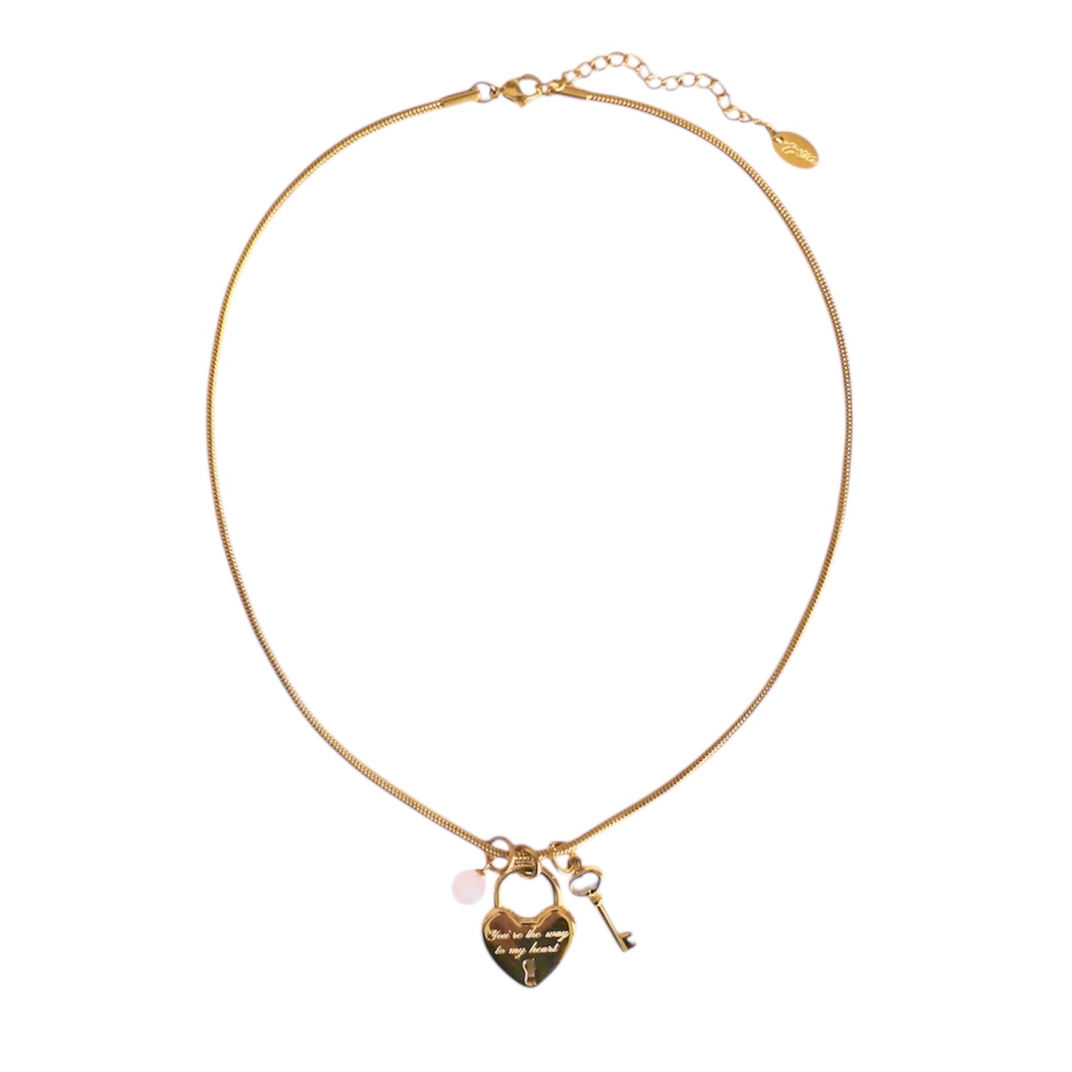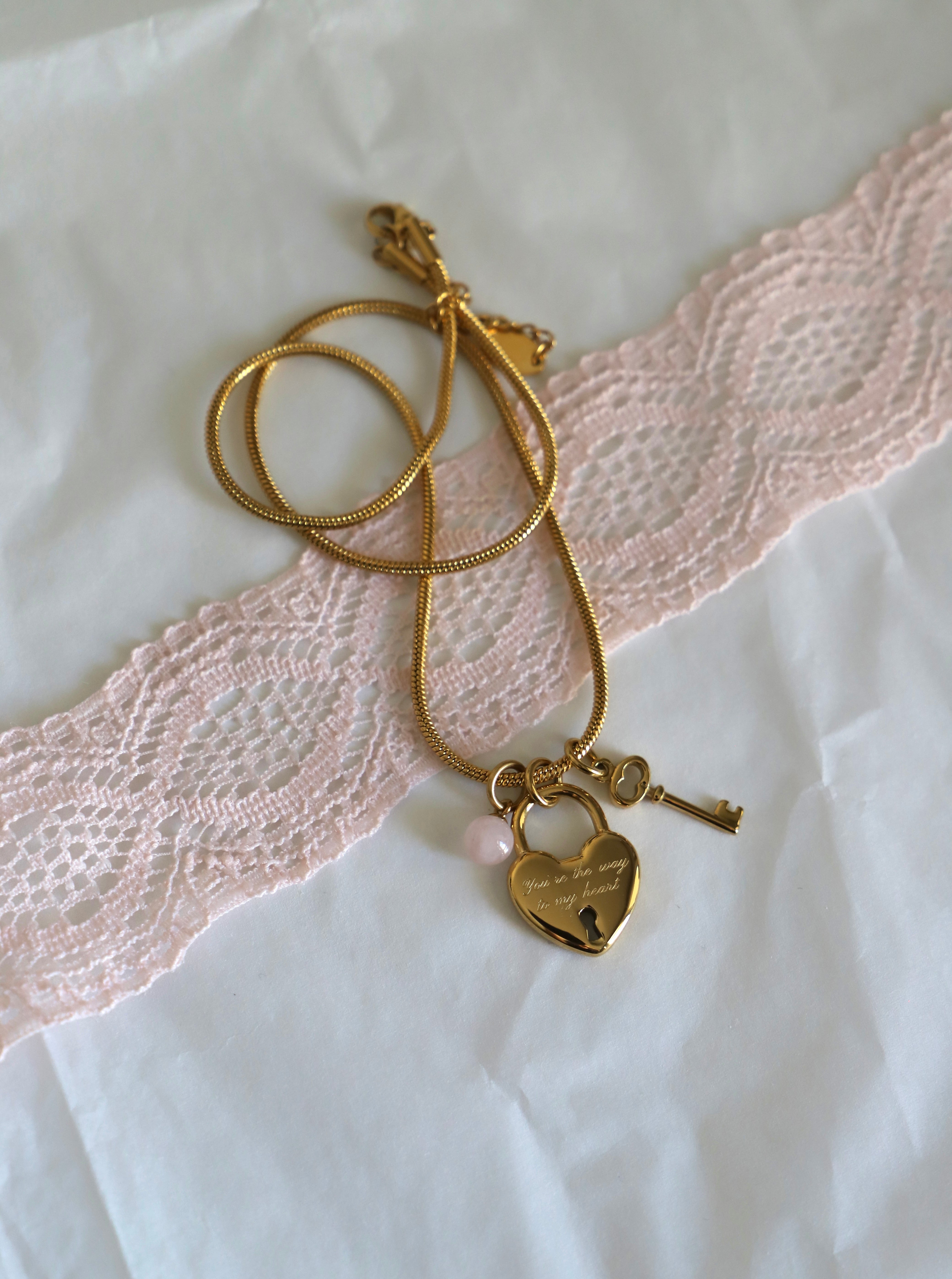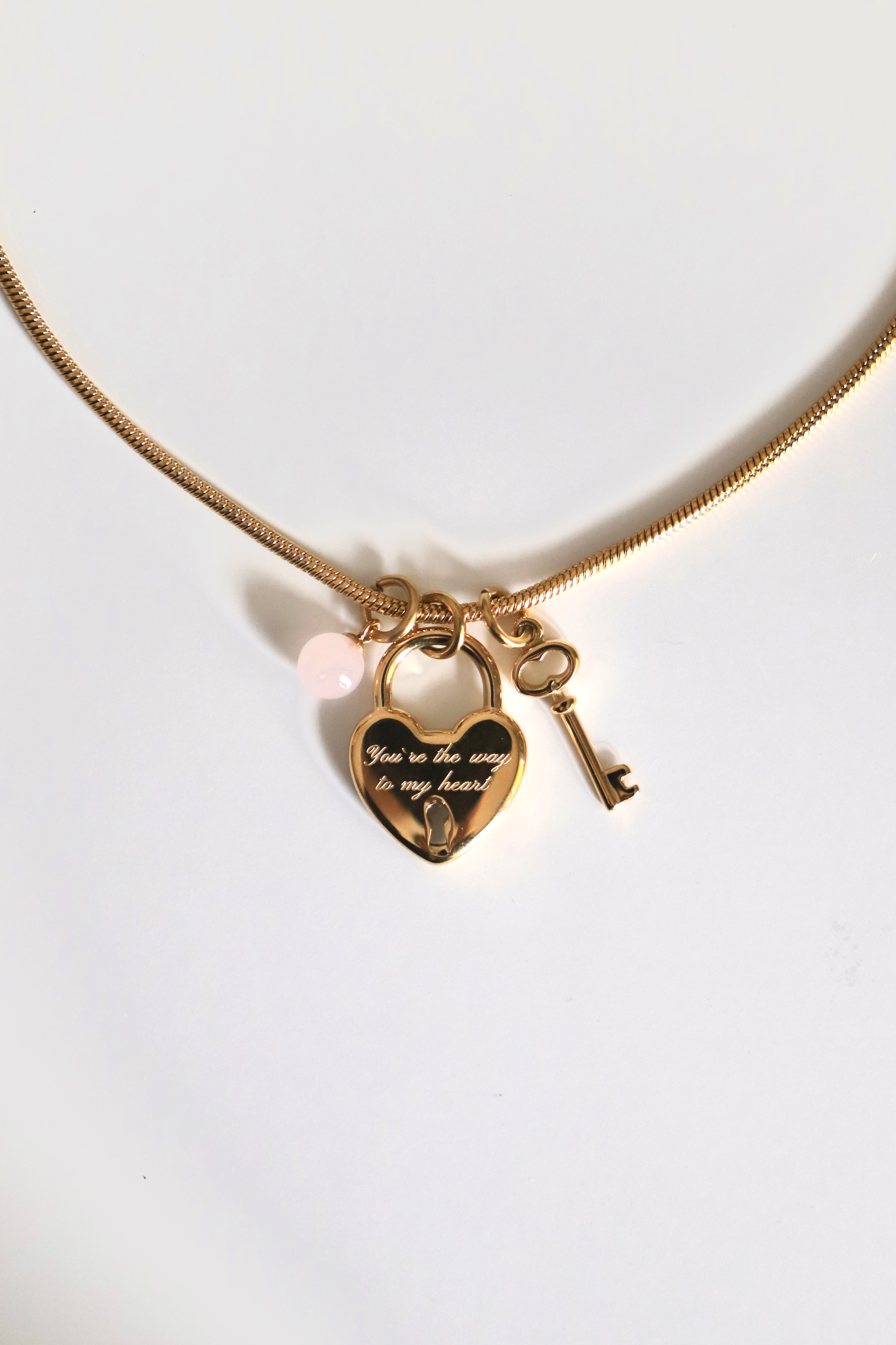 A necklace with three charms: A lock shaped charm with the words: "You're the way to my heart" engraved on the front, a key shaped charm, and a natural, spherical shaped rose quartz stone charm.