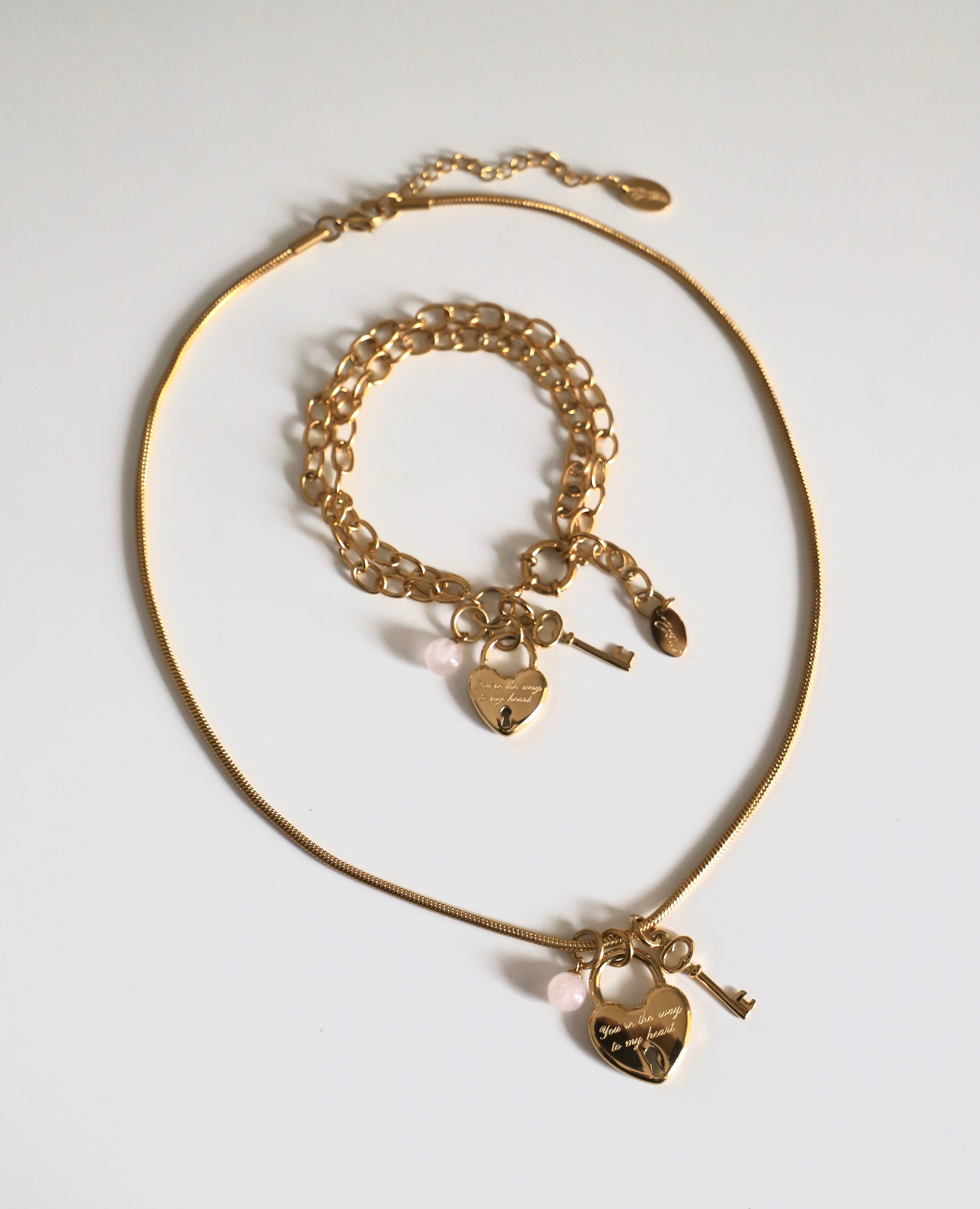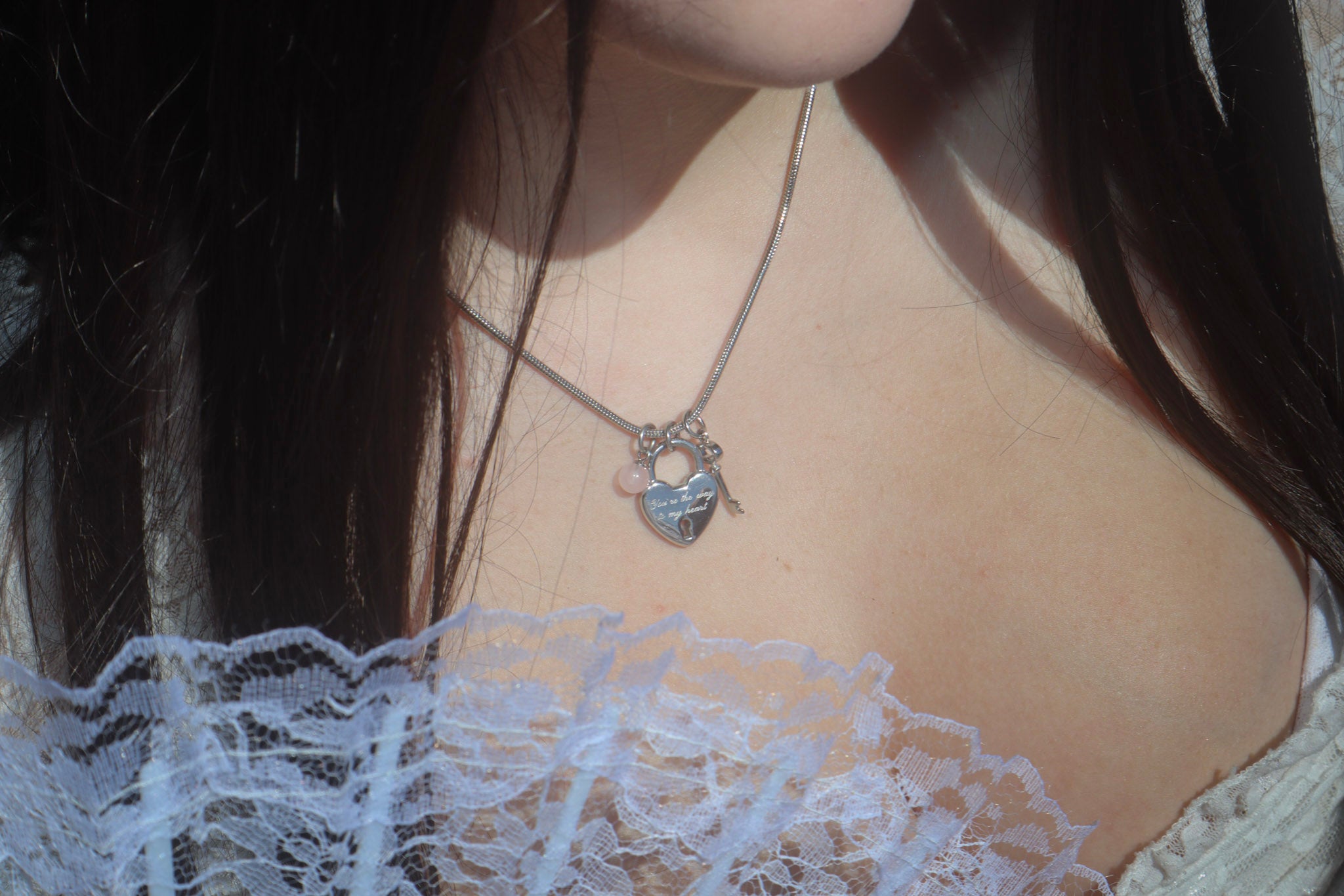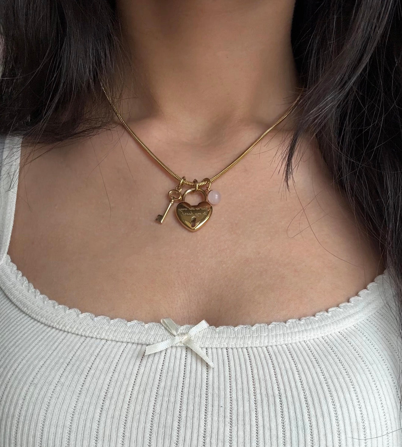 A necklace with three charms: A lock shaped charm with the words: "You're the way to my heart" engraved on the front, a key shaped charm, and a natural, spherical shaped rose quartz stone charm.